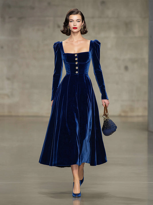 Elegant Blue Velvet Square Neck Button Midi Dress