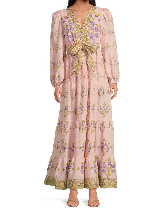 Floral Printed Long Sleeve V-Neck Self Tie Maxi Dress