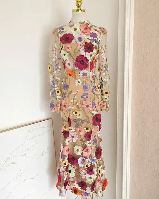 Long Sleeves Floral Embroidery Fishtail Midi Dress