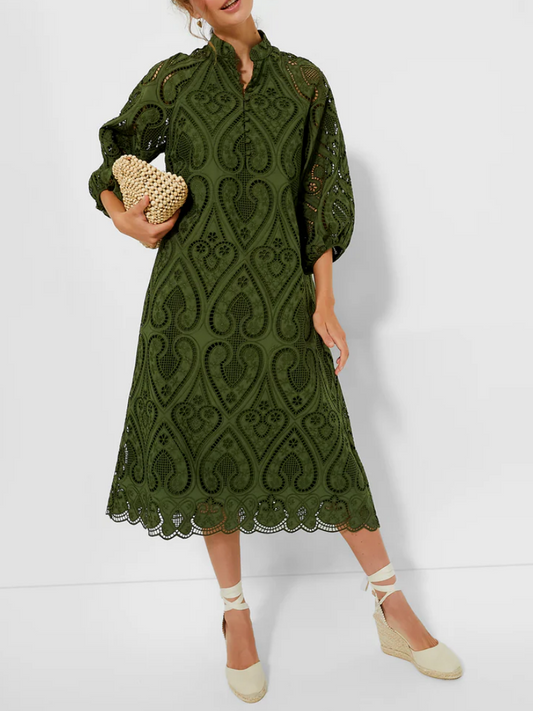 Balloon Sleeves Mandarin Collar Eyelet Lace Dress
