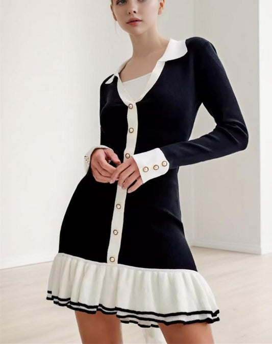 Black and White Buttoned Lace-Up Dress