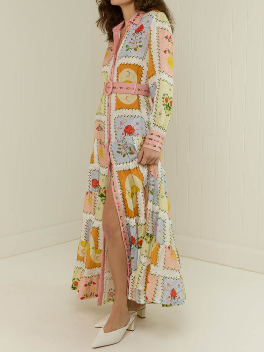 Floral Print Long Sleeve Tie Front Maxi Dress