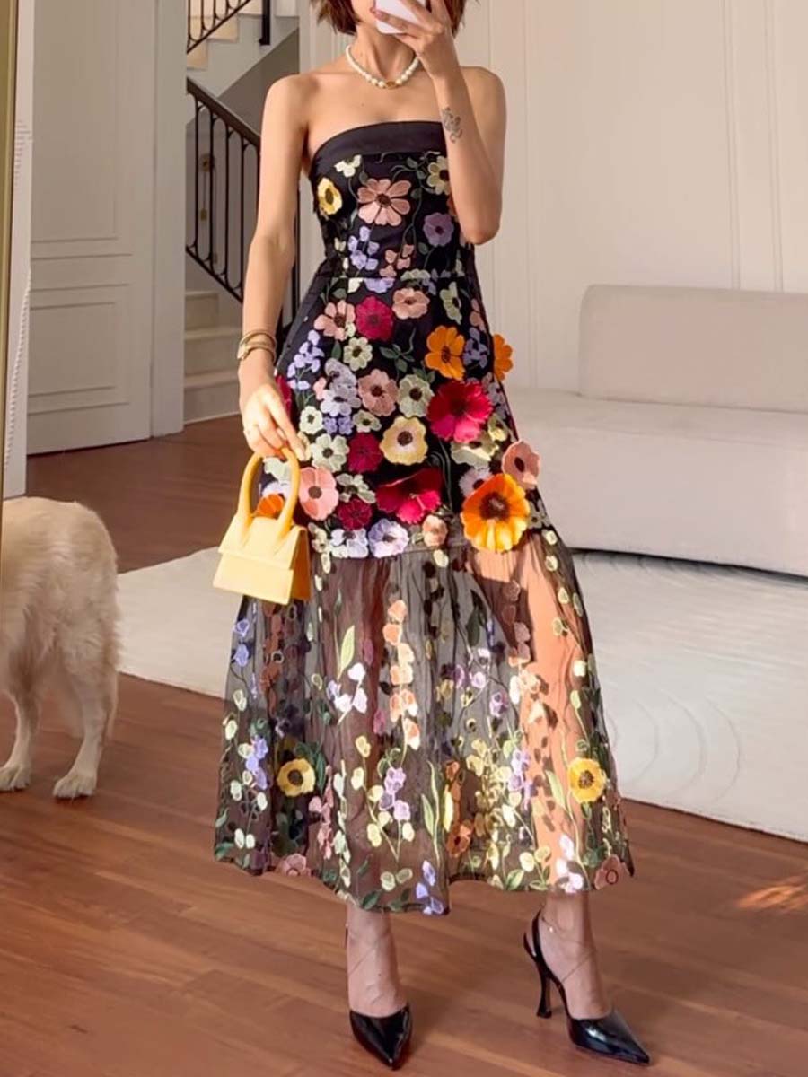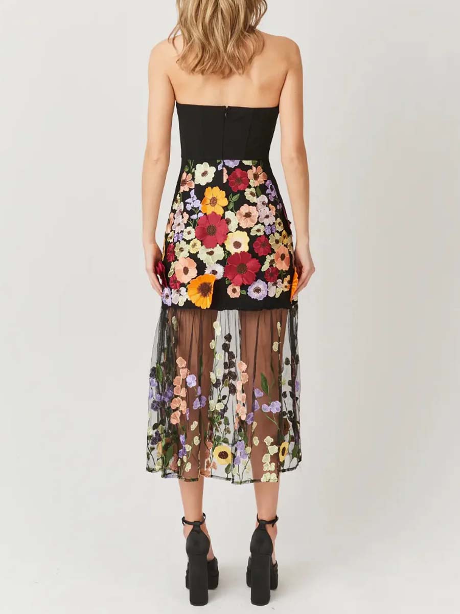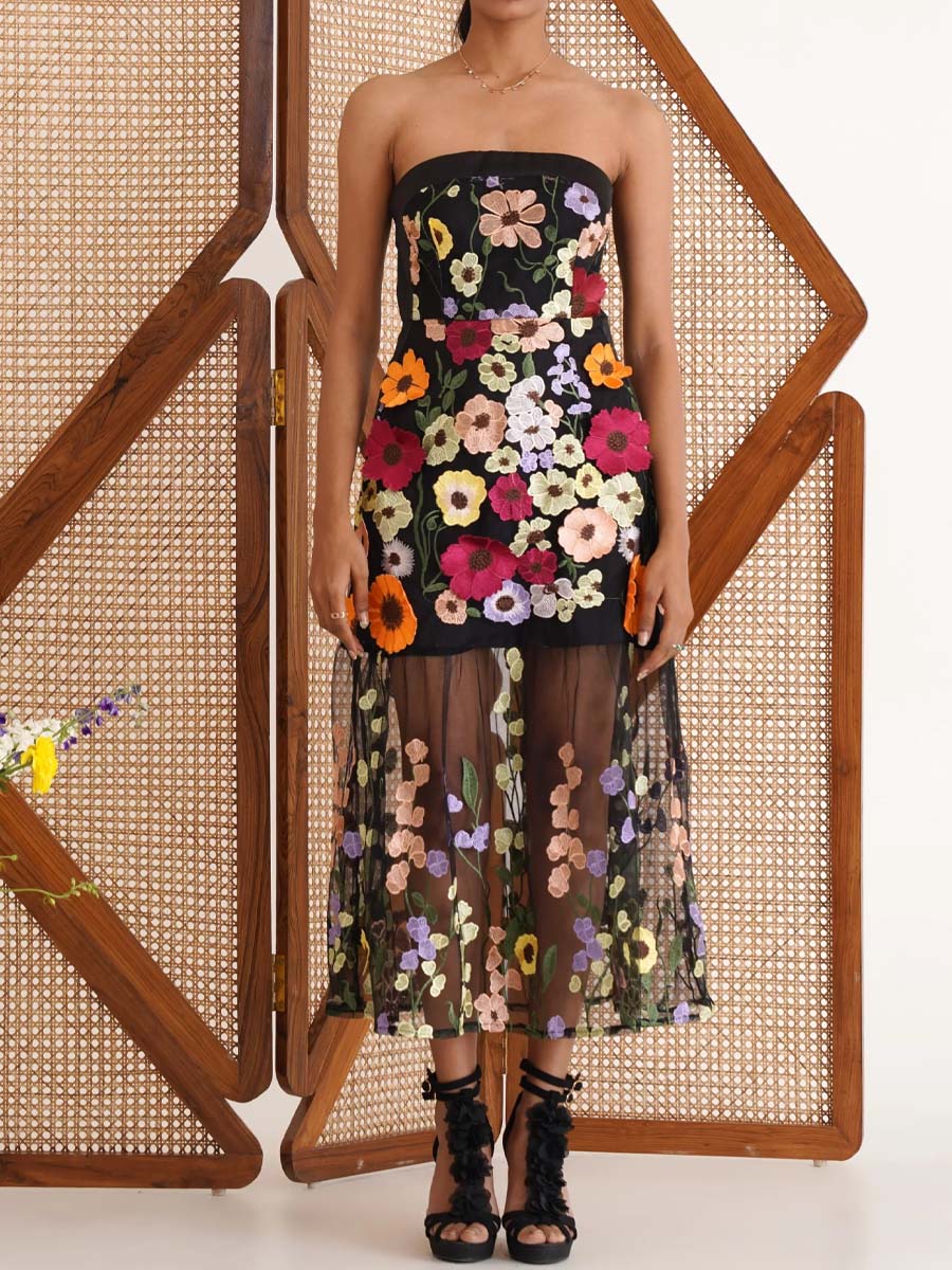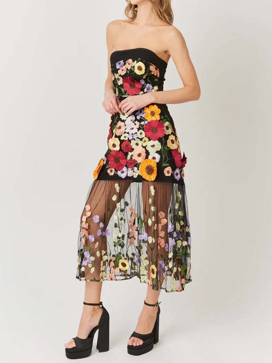 - Capture the essence of romance with our Salo Floral Embroidered Dress! The Floral Embroidered Dress features delicate lace and floral embroidery, crafting a romantic and elegant strapless design. The fitted silhouette embodies sophistication. To elevate your look, pair it seamlessly with delicate gold accessories and strappy heels.