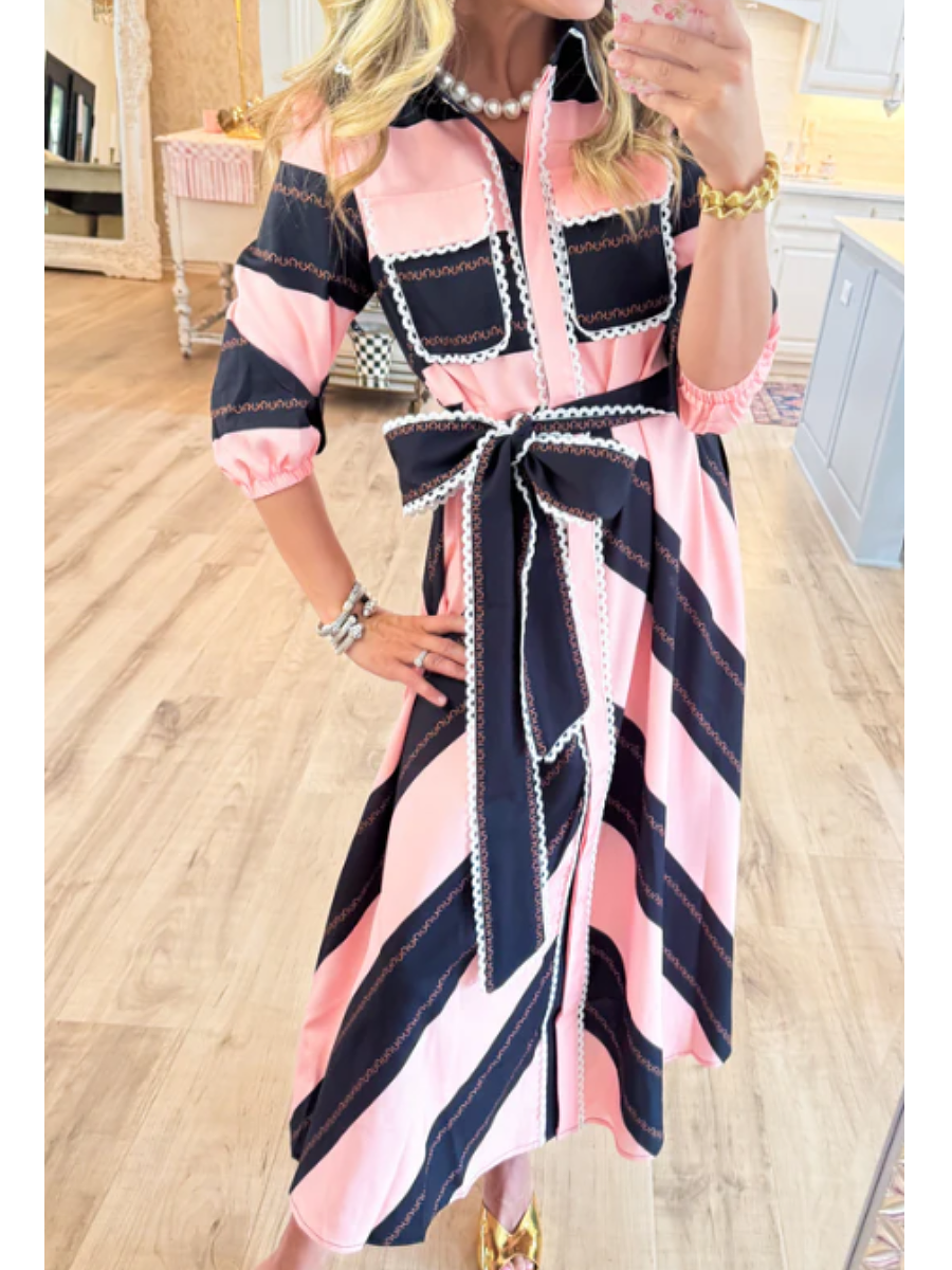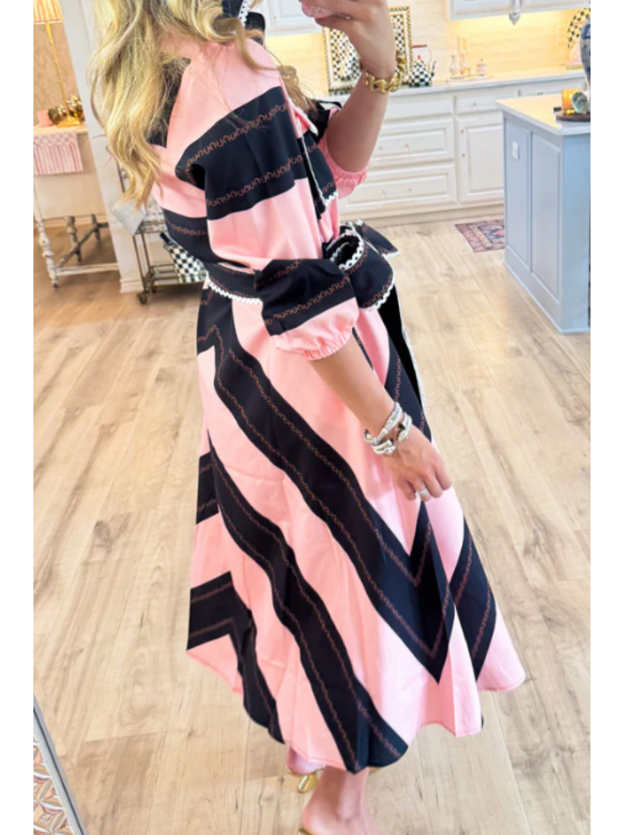 - Features a vibrant pink and navy striped pattern with decorative stitching.