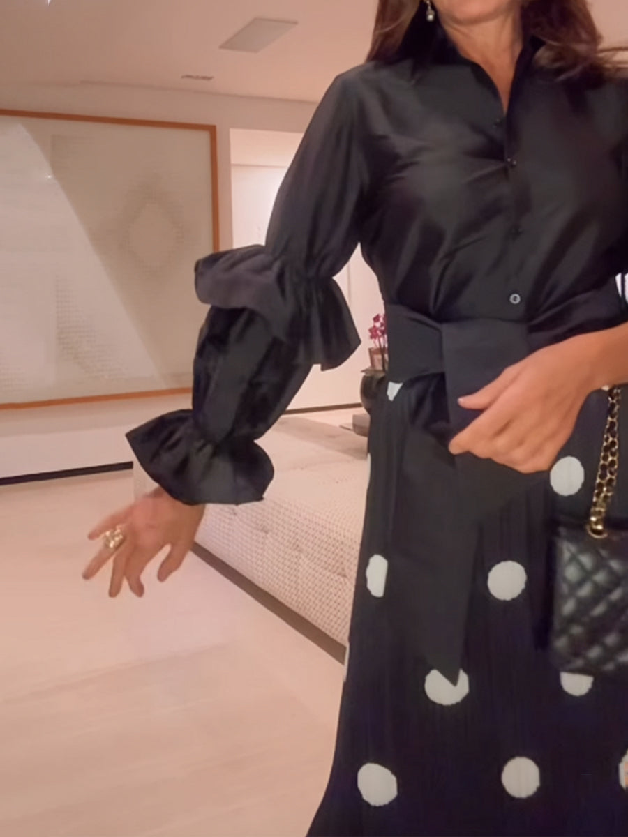 - Elegant black dress with white polka dots, suitable for formal and semi-formal occasions.