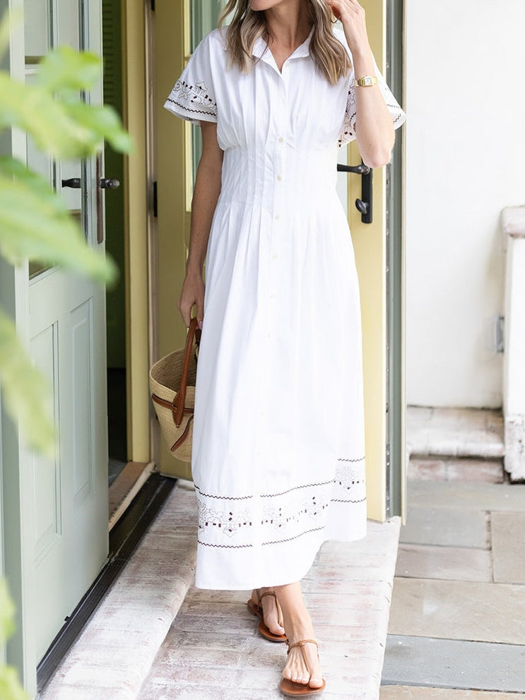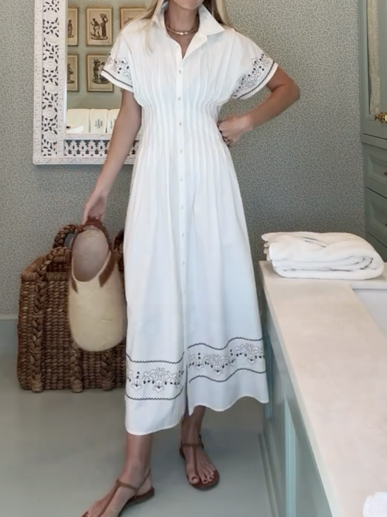 A new shirt dress with embroidered detailing. With a flattering pintuck corseted waist, collar, button-up front and A-line silhouette, we love this ultra-feminine and ethereal style. The Dress is made of 100% cotton poplin and features geometric embroidery on the sleeve and hem.