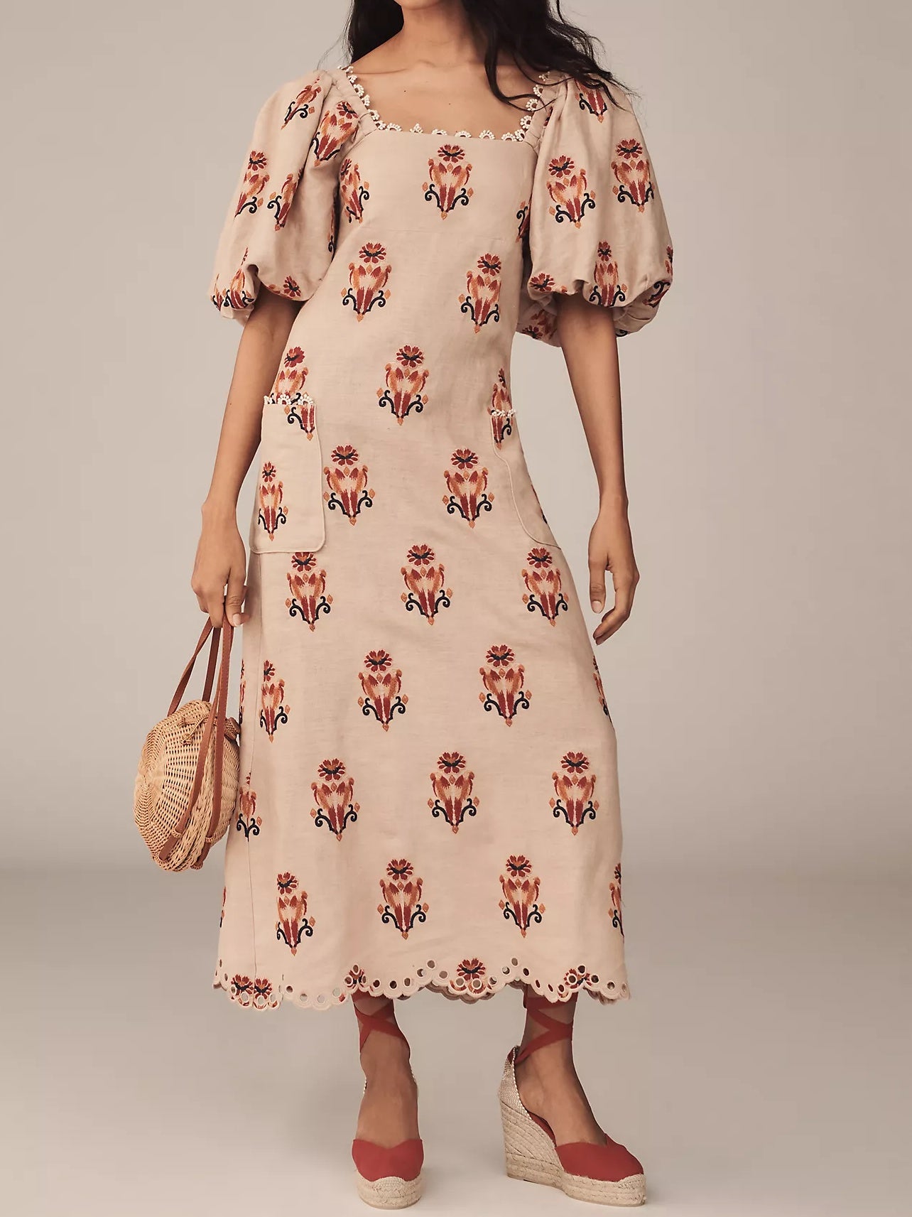 Embroidered Puff Sleeve Square Collar Dress