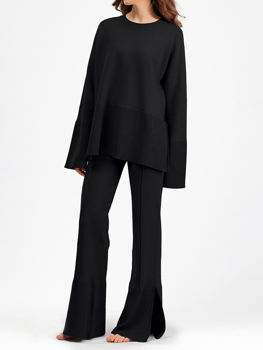 Fashion Trumpet Sleeve Round Neck Slit Loose Knitted Suit