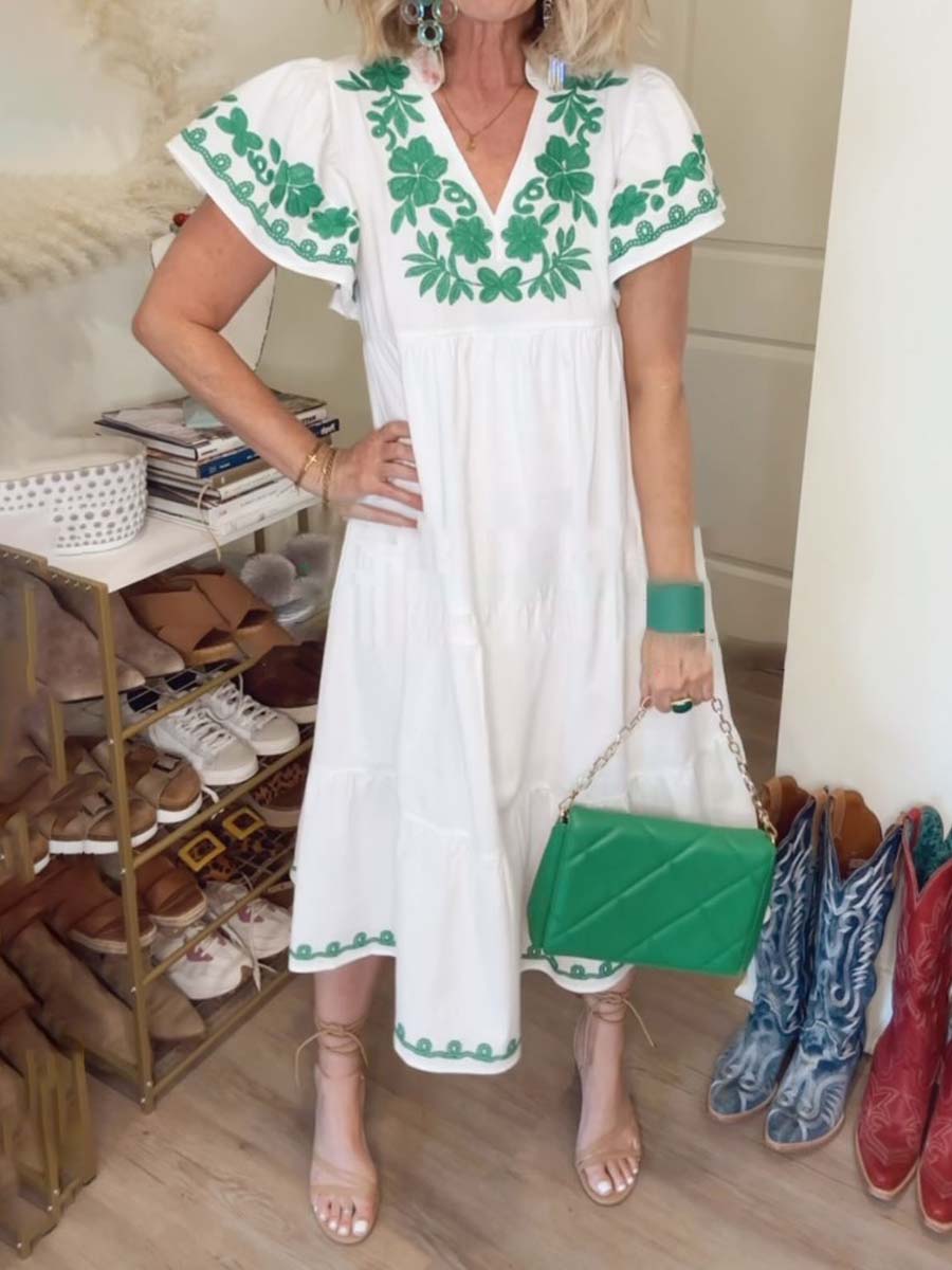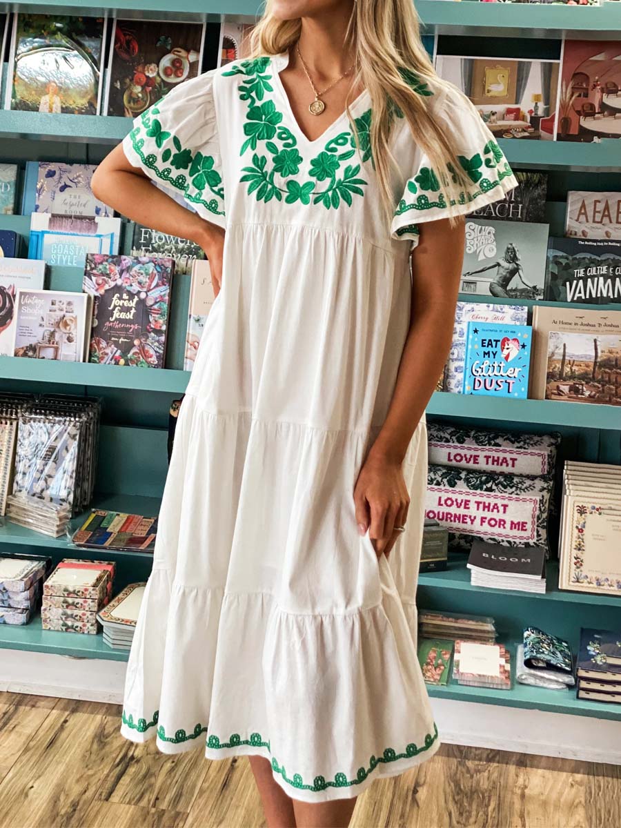 - Get ready to turn heads in our Embroidered Midi Dress! This best-seller is back in a fresh green color, perfect for spring or St. Patrick's Day. The flutter sleeve and v-neck add a touch of femininity, while the embroidered flowers add a playful twist. Stand out in style with this must-have dress!