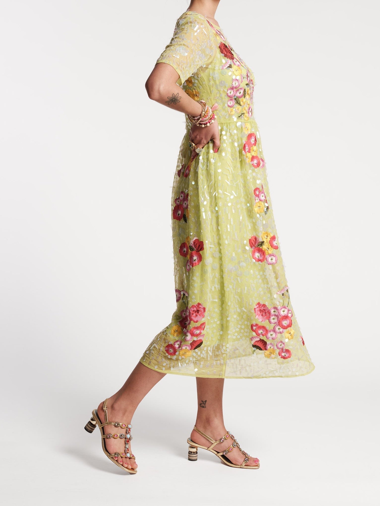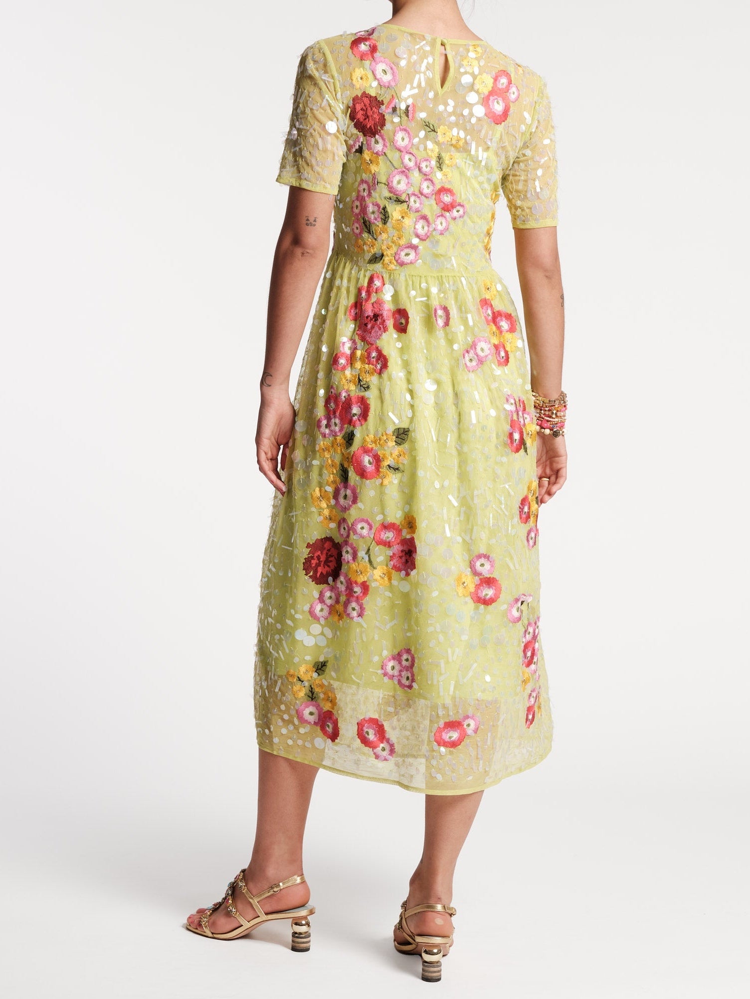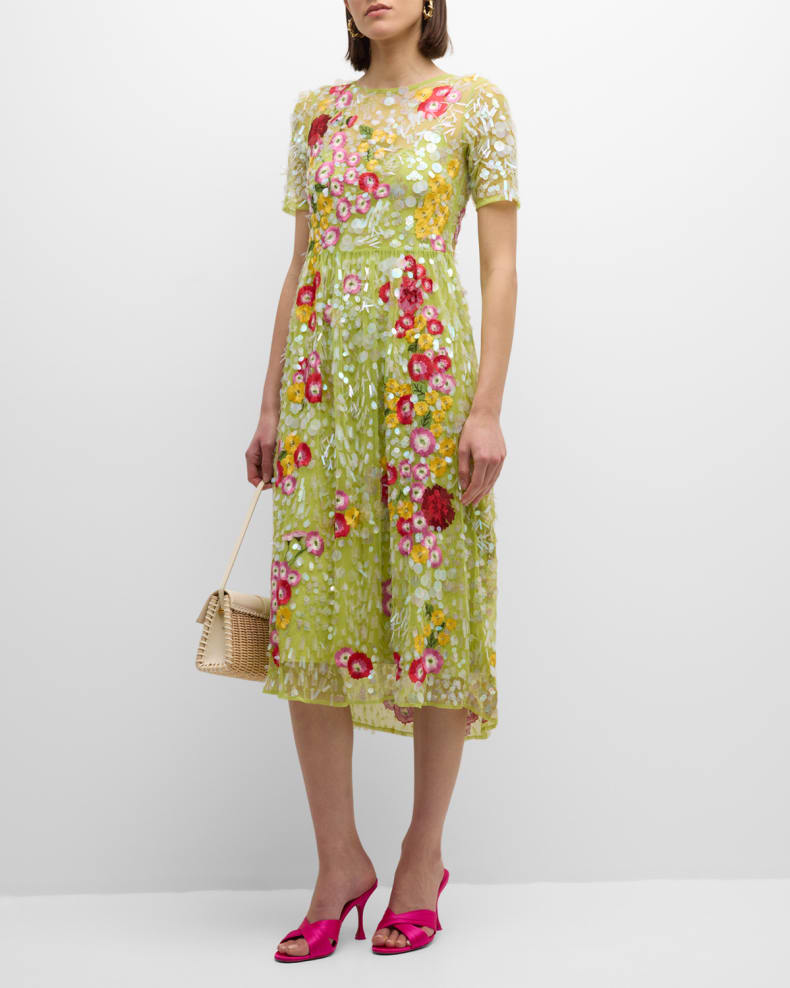 Faith takes special occasion looks to the next level with iridescent sequins, deconstructed florals, and vibrant embroidery on a delicate mesh design. A truly stunning spring motif, Faith is the perfect dress for soirees or weddings. Lined midi with short sleeves, wide rounded neckline, & empire waistline Layered