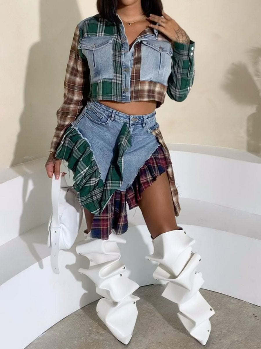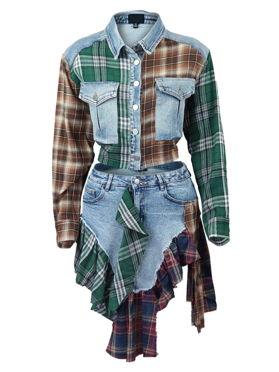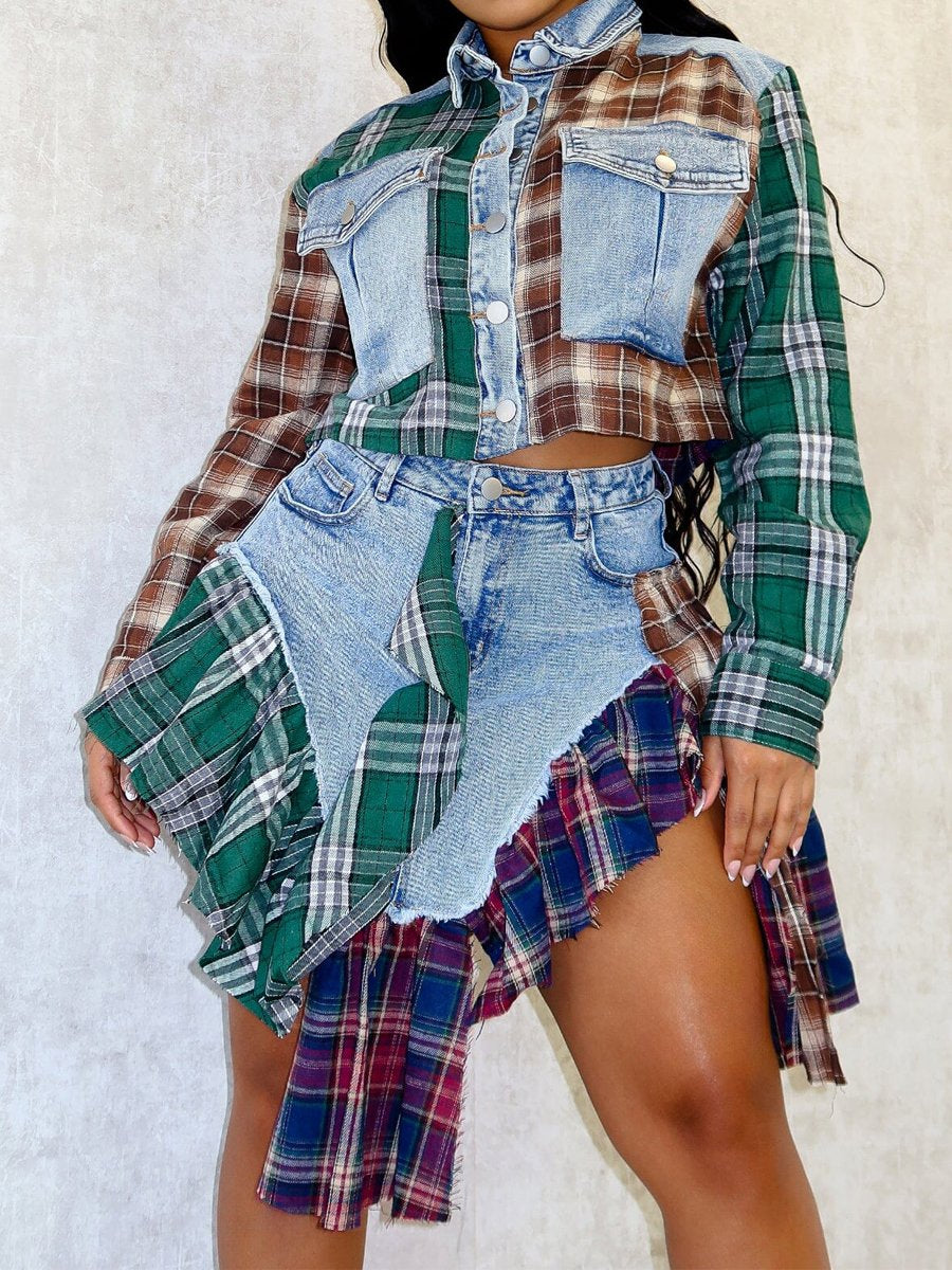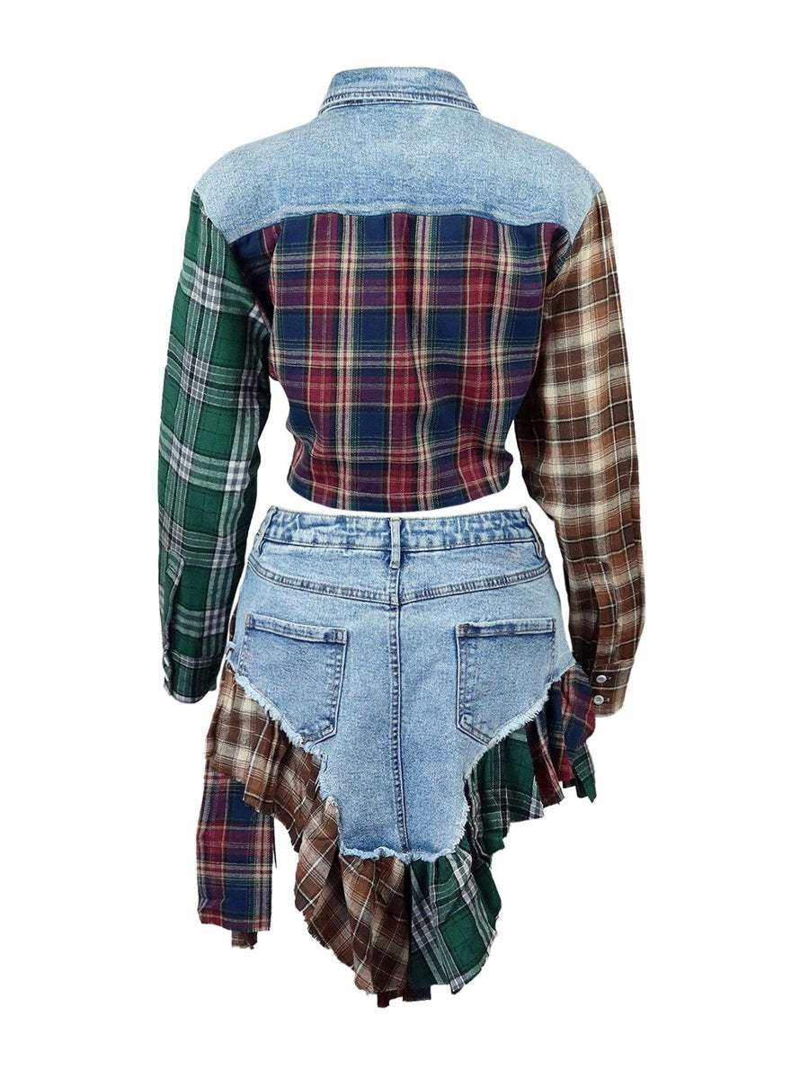 Irregular Denim Contrast Plaid Jacket & Skirt Set