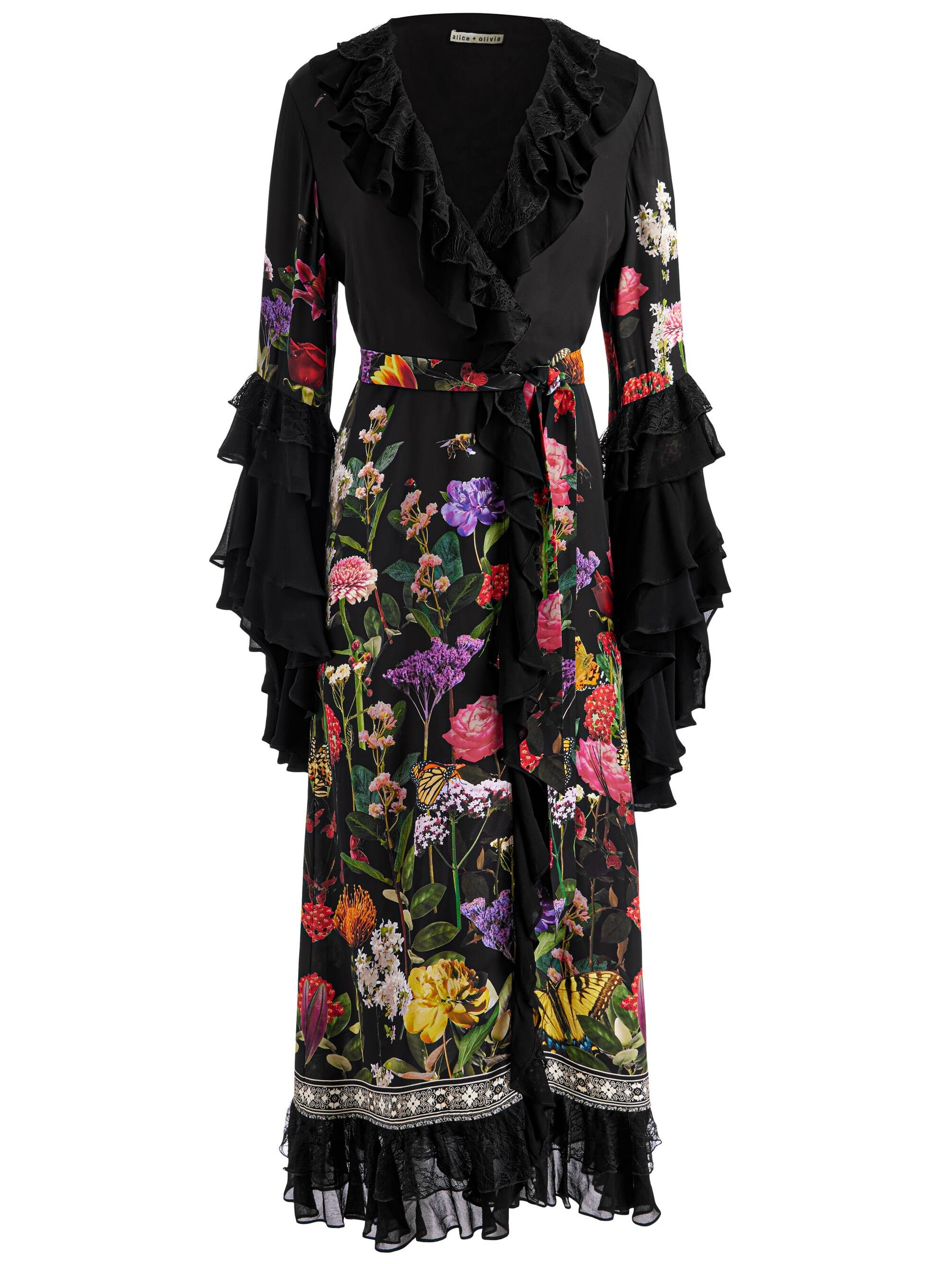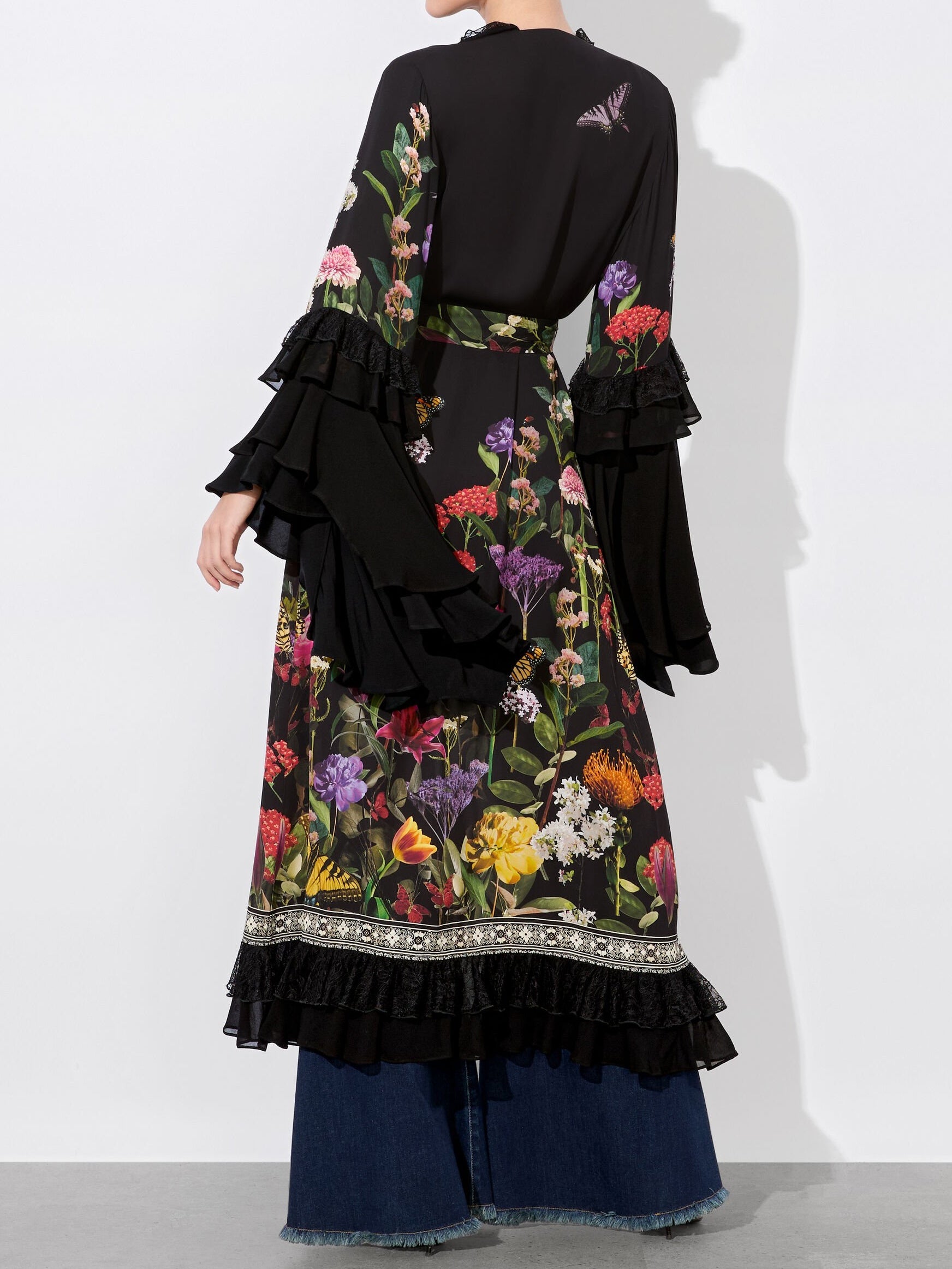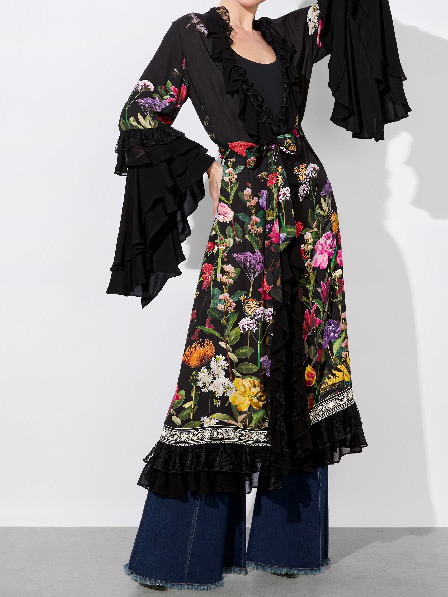 Our lace ruffles Maxi Robe is the epitome of bohemian chic. It’s cut from lightweight, semi-sheer viscose printed with a stunning floral with a self-tie belt to cinch its relaxed, maxi shape. Flutter sleeves and lace ruffles throughout further its alluring whimsy. Flowy and feminine, it’s perfect for throwing over swimwear or layering over a tee-shirt and denim.
